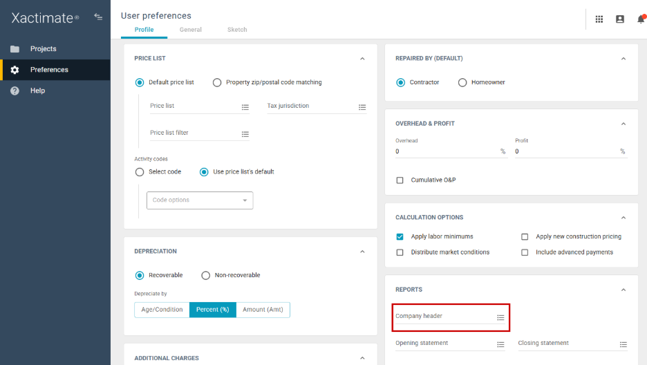 In Xactimate online, you can find the Company Header list in the Preferences page, under the Profiles tab, in the Reports section.