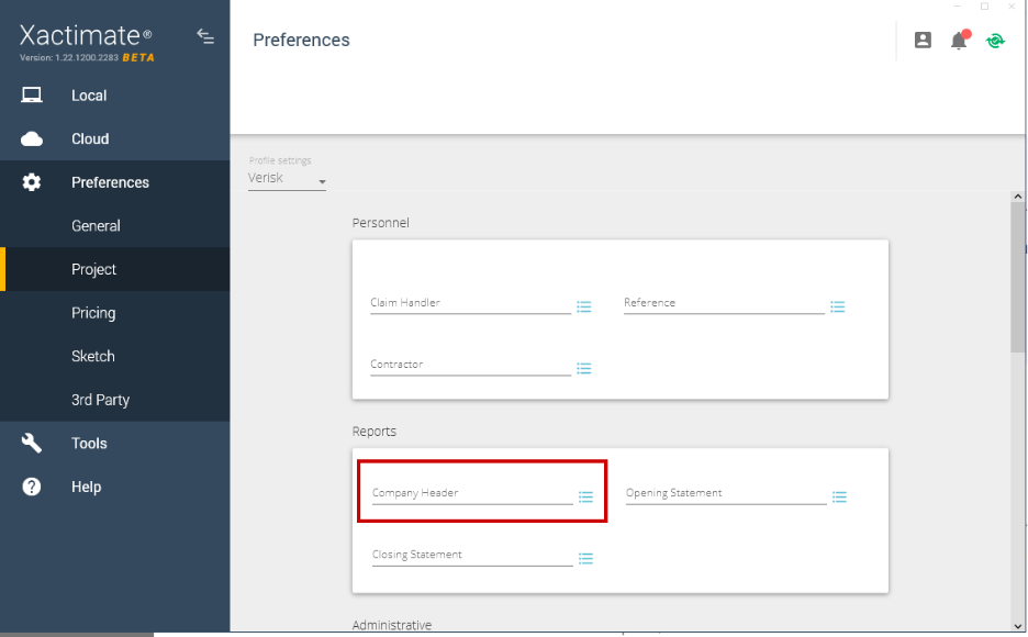 In Xactimate desktop (X1), the Company Header list is in the Preferences page, under the Profiles tab, in the Reports section.