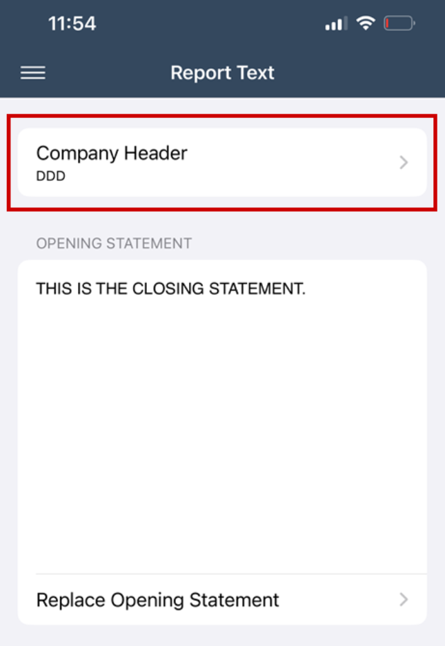 In Xactimate mobile, the Company Header list is in an open statement by selecting More, then Report Text, under Company Header.