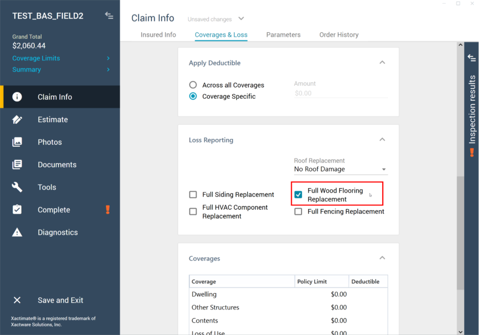 When the Loss Reporting Full Wood Flooring Replacement profile feature is active, the Full Wood Flooring Replacement checkbox appears in the Loss Reporting card, which is under the Coverages & Loss tab in Claim Info.