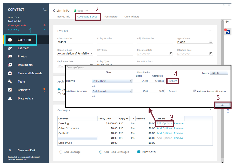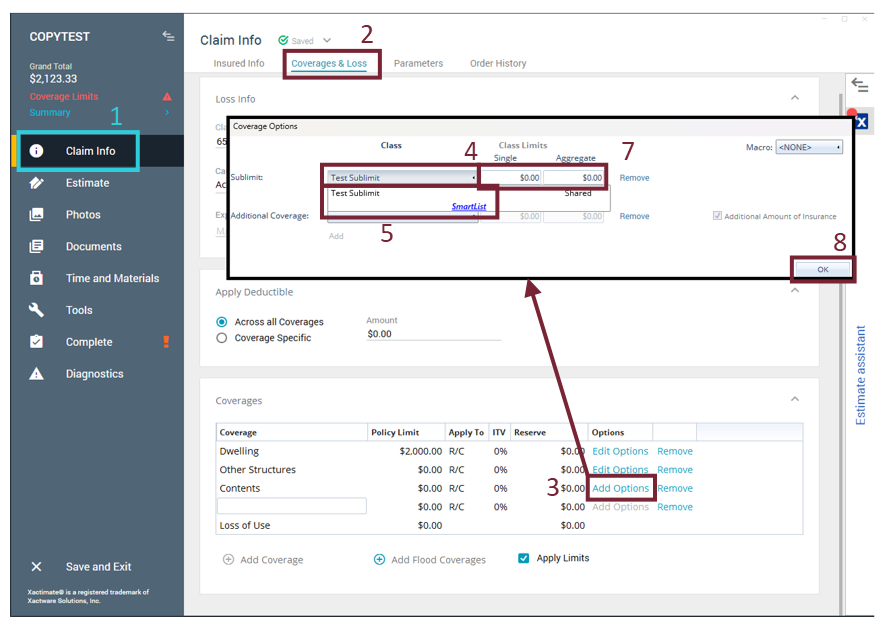 - Back on the Coverage Options screen, enter the class limits (single for a single item, aggregate for all the items in the sublimit).