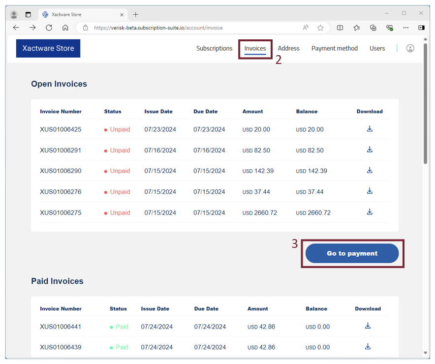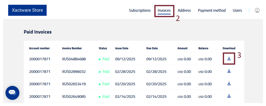 - In the row of the invoice you want to view, select the Download icon.