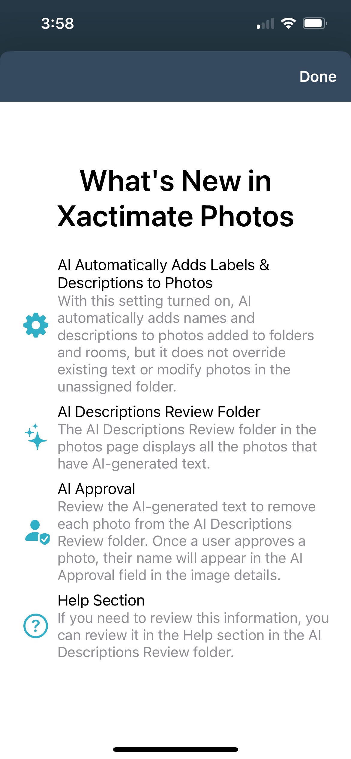 To access the AI text generation from within a project, select Photos in the navigation menu. If it is your first time accessing Photos with this feature enabled, an information screen appears that provides a high-level description of Xactimate’s AI labeling. When you are done reviewing the information, select Done.