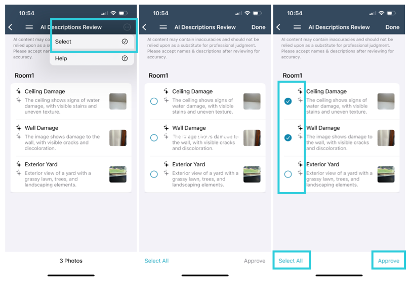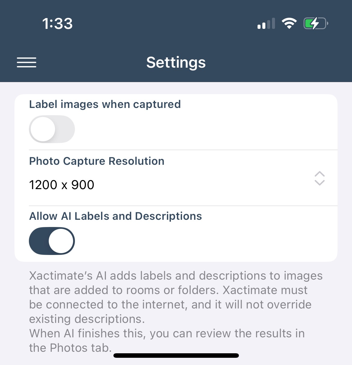 When enabled, Xactimate creates labels and descriptions for photos that do not already have them.but You must review and approve (or change) the generated content before completing the project to preserve the added text. Any AI-generated text that you do not approve or change is hidden once you complete the project.