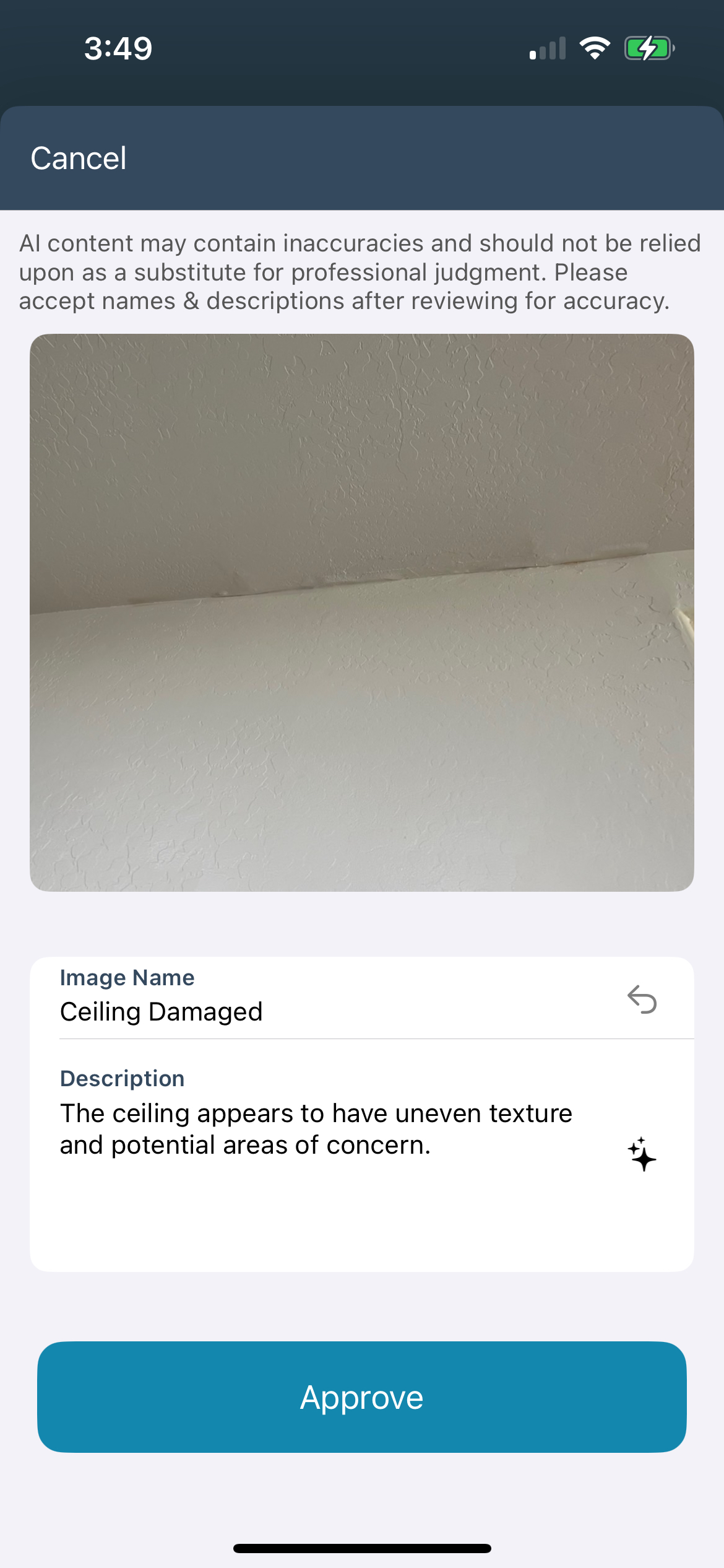 - Select the photo you want to review. This opens a larger version of the image with the image name and description underneath. If you have no changes to the AI-generated text, select Approve under the photo to accept the text.