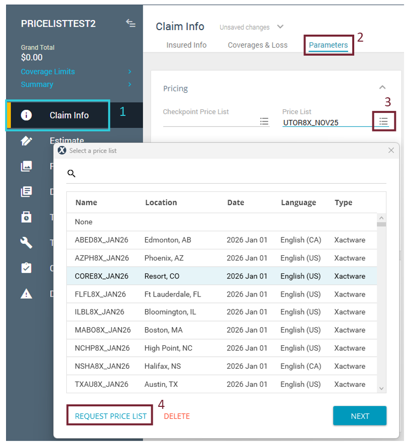 Within an estimate, select Claim Info in the left navigation menu.