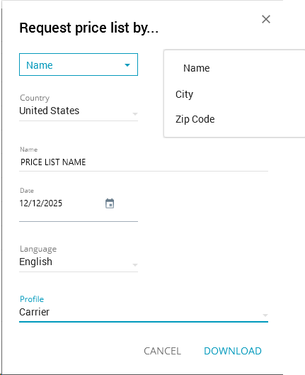 Select REQUEST PRICE LIST. The Request price list by dialog box will appear.