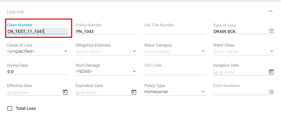 When the Enable Claim Number on assignment profile feature is on, the Claim Number field is editable in assignments in Claim Info, under Coverages & Loss, in the Loss Info section.