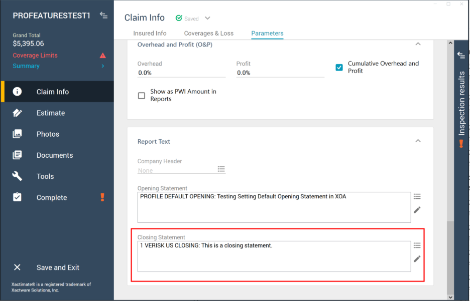 When the No closing statement profile feature is active, all text and user interface (UI) elements pertaining to closing statements are unavailable in Xactimate. This includes the Closing Statement section in Parameters and all report text.