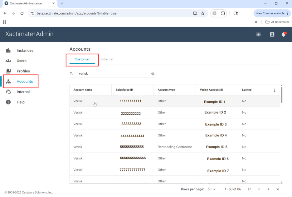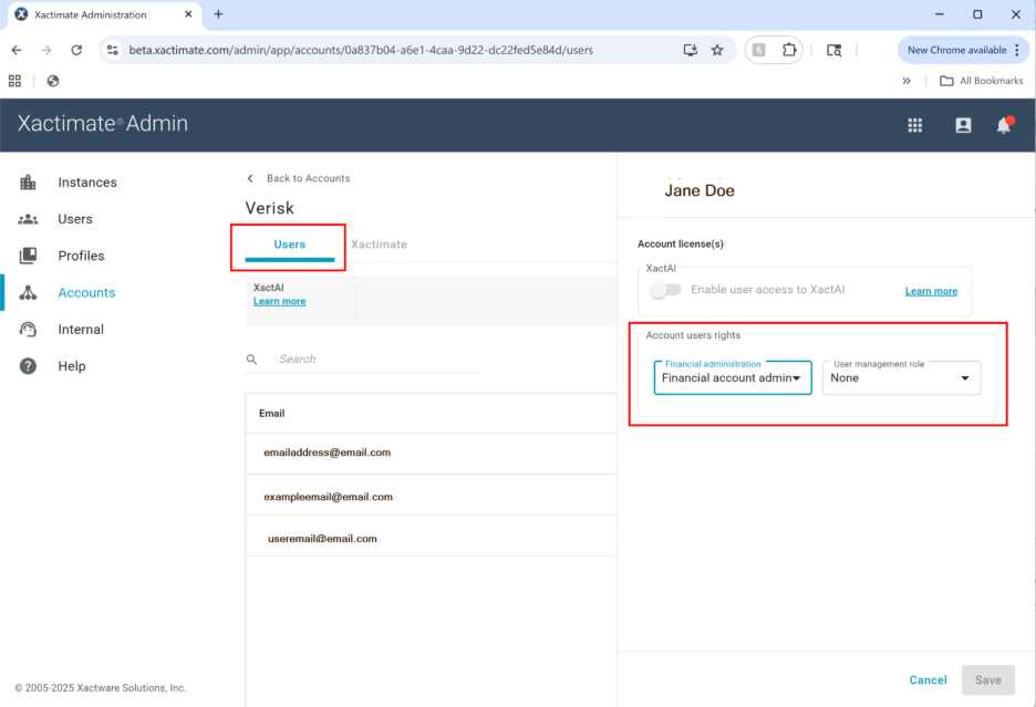 In the Accounts tab of Xactimate Admin, account admins and financial account admins can set other users as account admins or financial account admins (formerly called global admins).