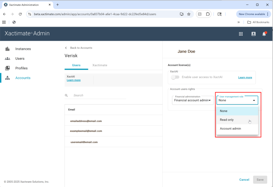 There are two types of account admins: read only and account admins. When a user is set as a read only account admin, they can view data in the Accounts tab of Xactimate Admin but cannot make changes.