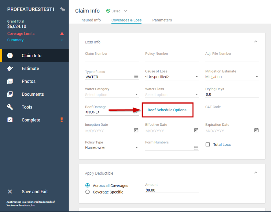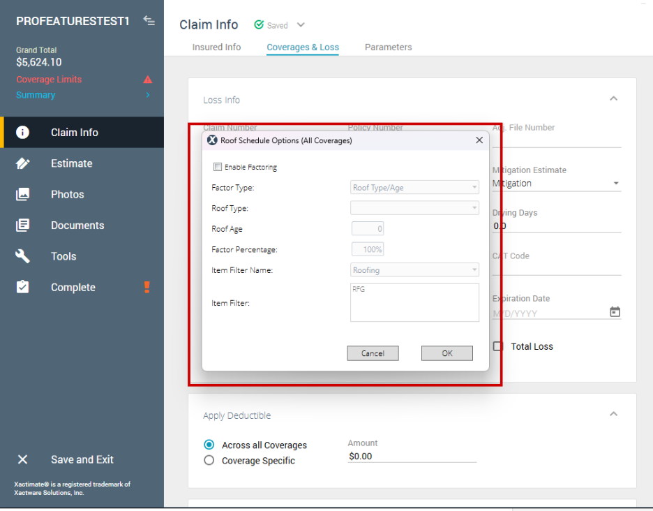 When the Roof factor options profile feature is on, the Roof Schedules Options link and corresponding dialog are available in the Loss Info section, which is in the Claim Info page under Coverages & Loss.
