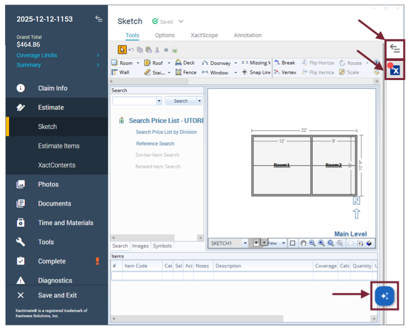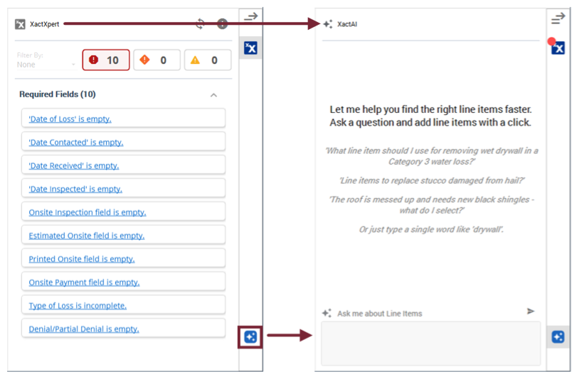 The Xactimate side drawer currently includes only XactXpert, but it will soon feature existing tools such as Global Changes Wizard, Reference Search, and Macros as well as two new and innovative tools: XactAI Line Item Advisor and XactGen. This change is meant to bring greater efficiency to the way you create, validate, and edit line items.