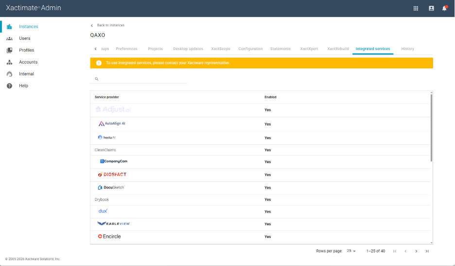 The new window opens to the Integrated services tab under Instances. From here, you can request more information about roofs, walls, and other items from the vendor(s) of your choice.