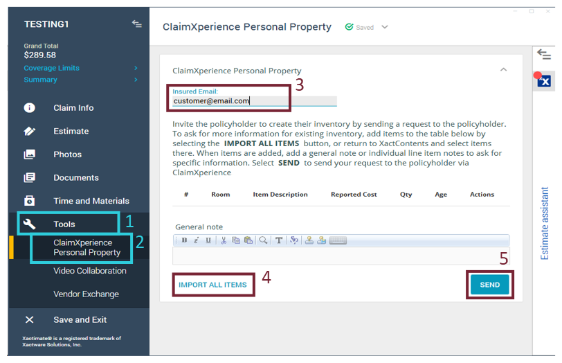 ClaimXperience Personal Property allows you to request line item data from the assignment claimant. If you have access to this feature, you can send policyholders an email with a link to their projects in ClaimXperience; there, they can add their items along with images, receipts, or other supporting files.