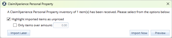 2. When prompted in the ClaimXperience Personal Property window that appears, select Import Now.