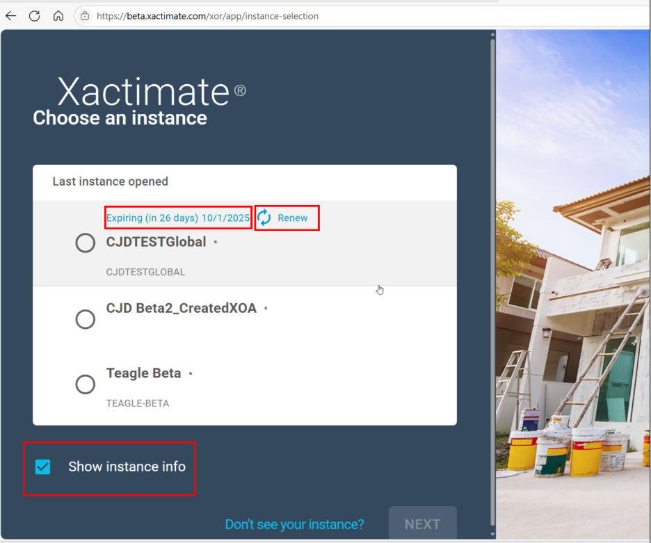 Note: If the Show instance info checkbox is selected, important information displays next to instance names on the list. This includes the date an instance expires and a Renew button to renew Xactimate subscriptions.