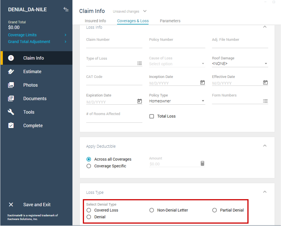 When this profile feature is active, find denial options by selecting Claim Info and then the Coverages & Loss tab. The options are in the Loss Type section. You can choose from the following denial types: