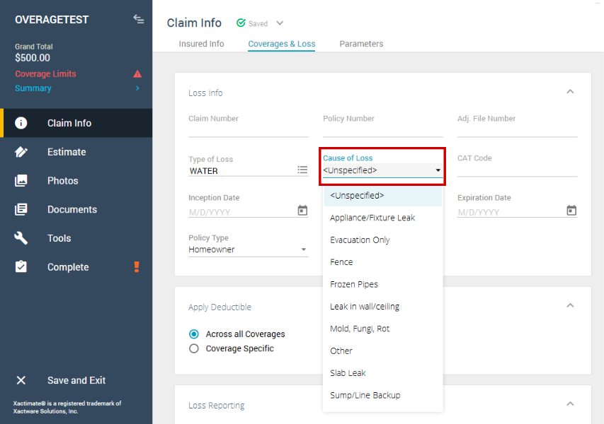 When this profile feature is active, the Cause of Loss field is required. You can find the Cause of Loss field in Claim Info > Coverages & Loss > Loss Info.