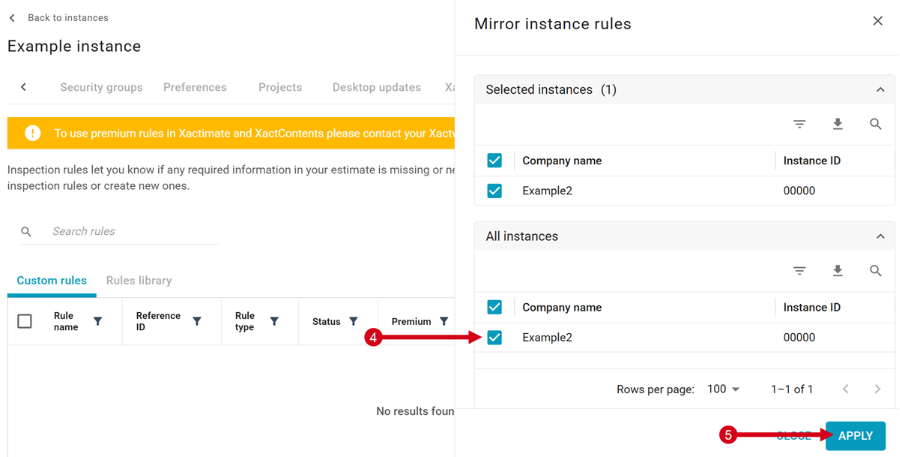 - Select the instances or profiles in the All instances section that you want to mirror rules to.