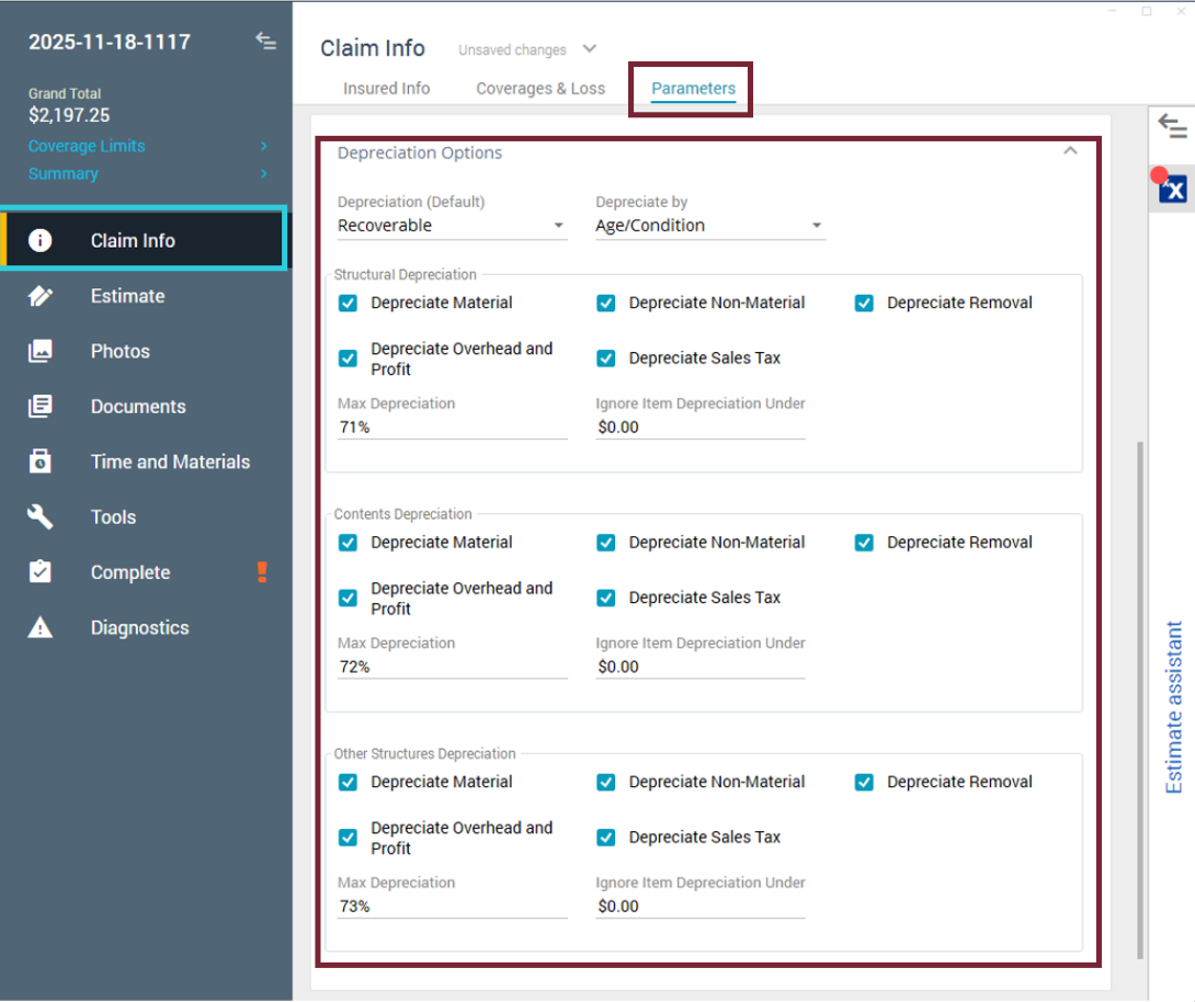 Depreciation Options may appear differently depending on whether Depreciation by Coverage Type is active for your instance in the state in which the project address is listed. To learn how to set depreciation for instances, review our Set depreciation defaults in instances in Xactimate Admin article.