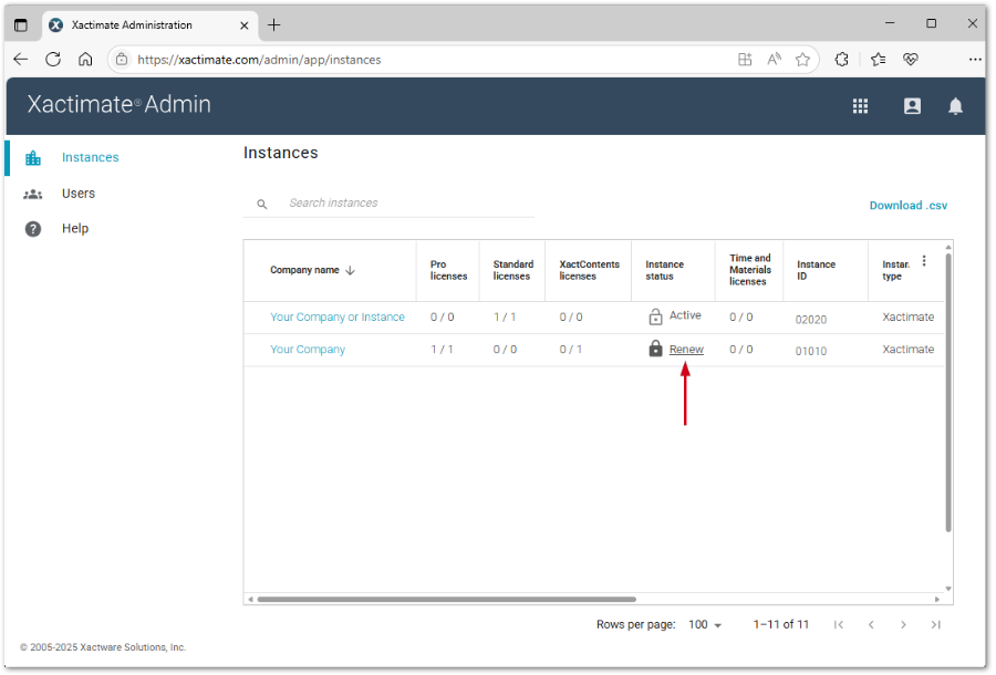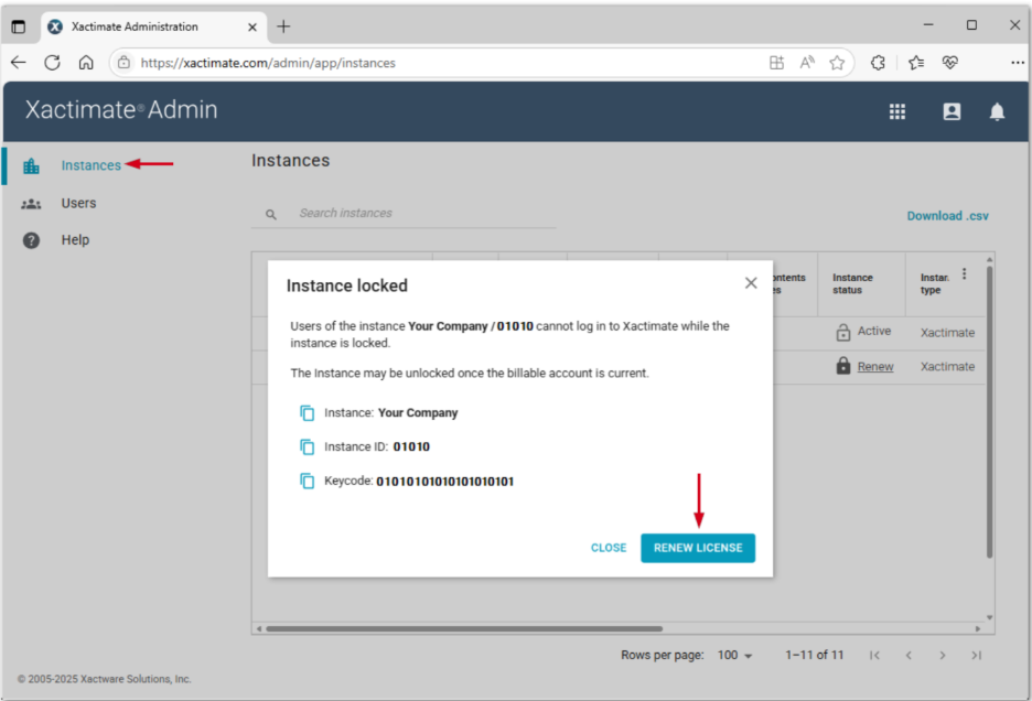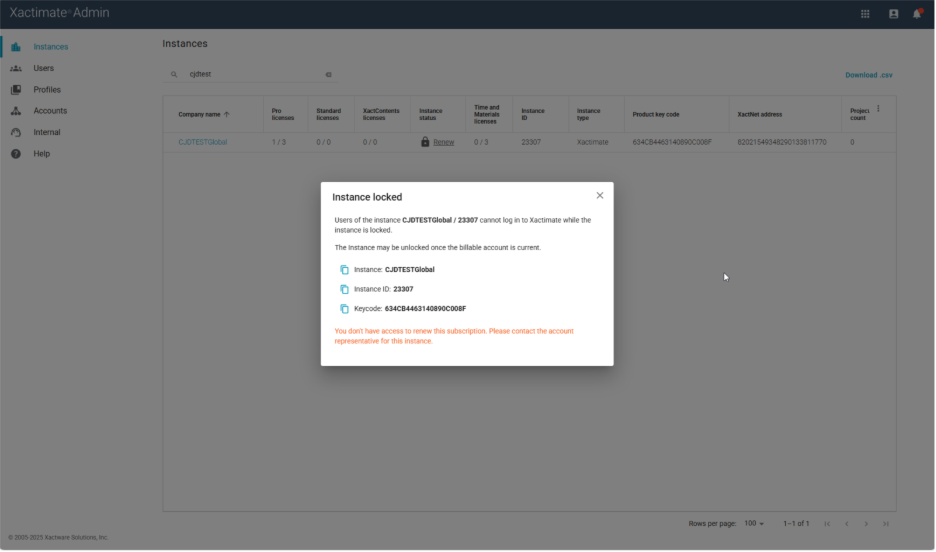 If you are a financial account administrator and have only one instance, a popup window appears with a link to renew your subscription when you log in to Xactimate Admin.
