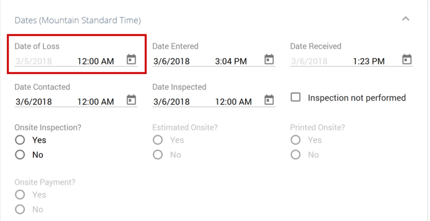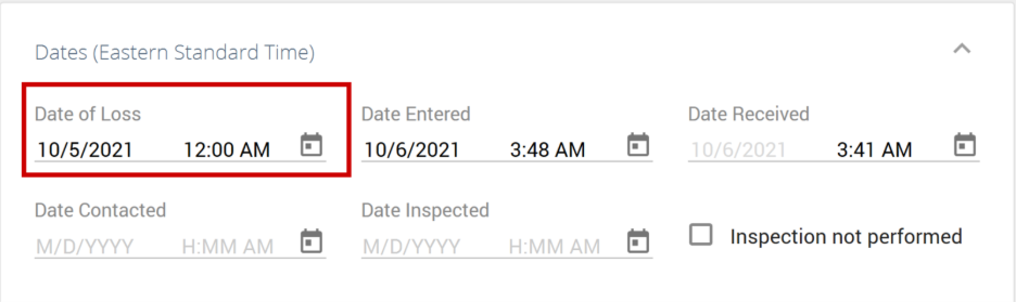 If this profile feature is off, the Date of Loss field is visible but can’t be edited.