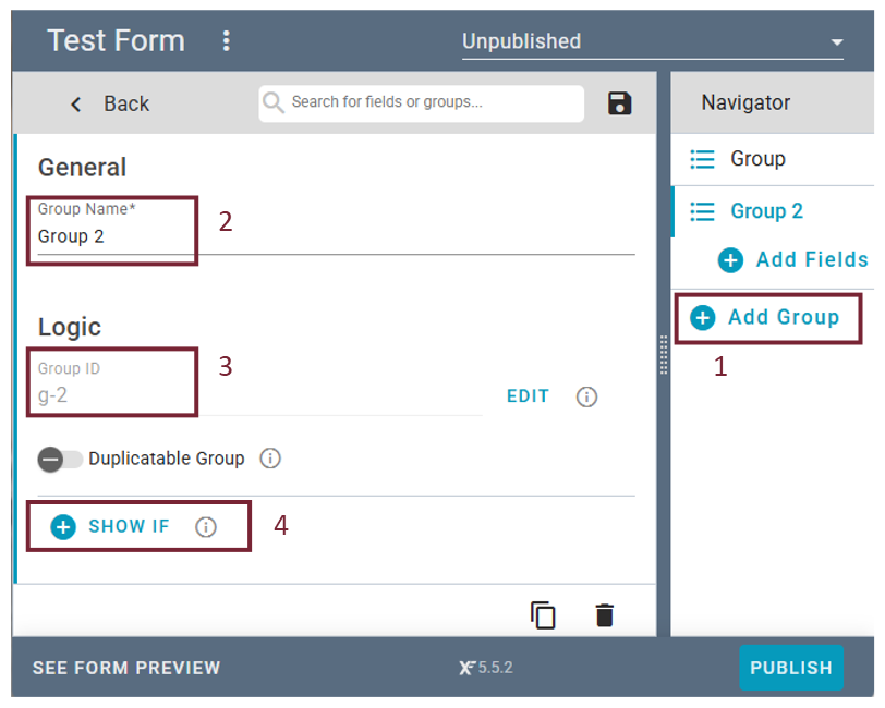 - If helpful, modify the Group ID. The Group ID helps you identify the group when entering logic for the form.