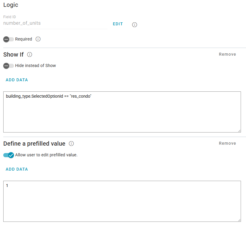 • Show If: This section lets you define when the field or group appears in the form. You can select Add Data for suggestions when creating your logic.