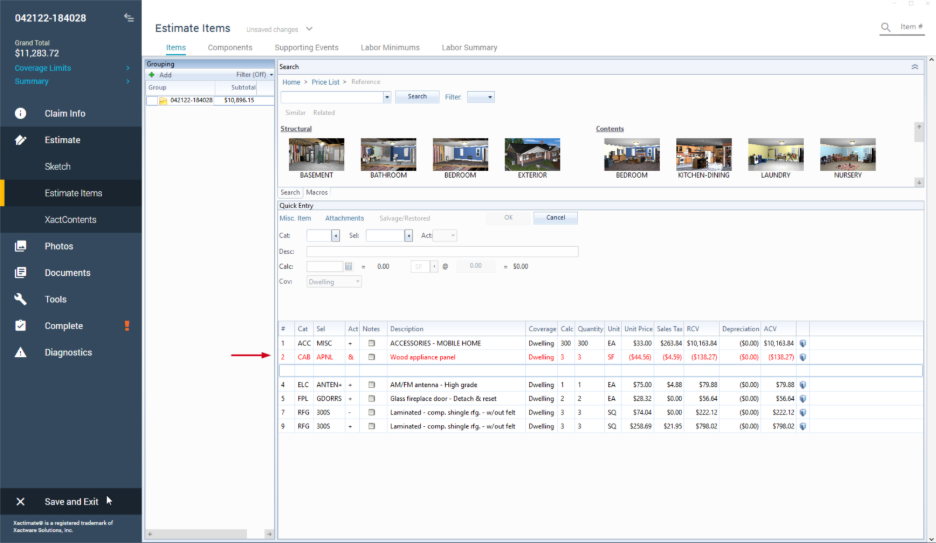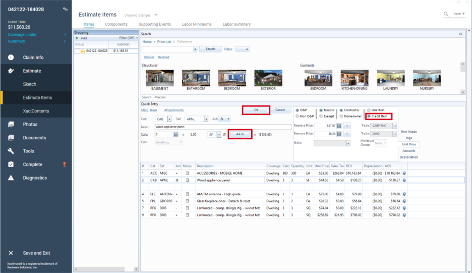 This profile feature allows users to mark items as credit items. Credit items are credited to the policyholder or customer and are subtracted from the grand total of the project or estimate.