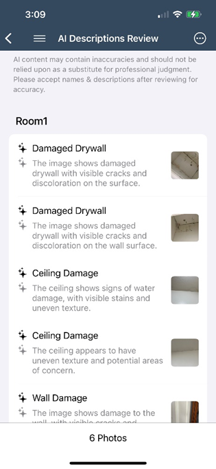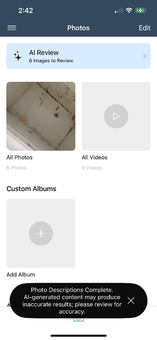 Una vez que agrega fotos a una habitación o carpeta, XactAI comienza automáticamente a revisar las imágenes y crear un nombre y una descripción para cada una. Una vez que inicia, aparece un encabezado en la parte superior de la pantalla Fotos llamado Revisión de IA.