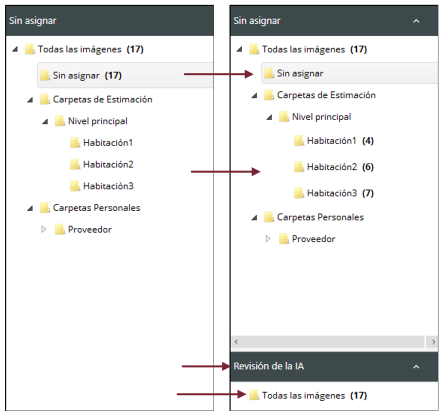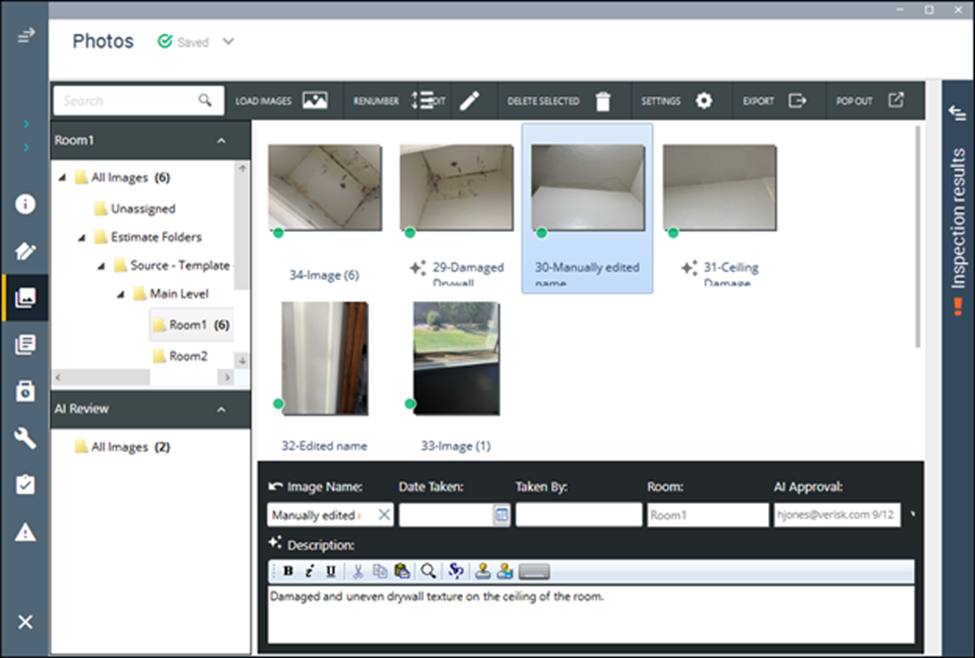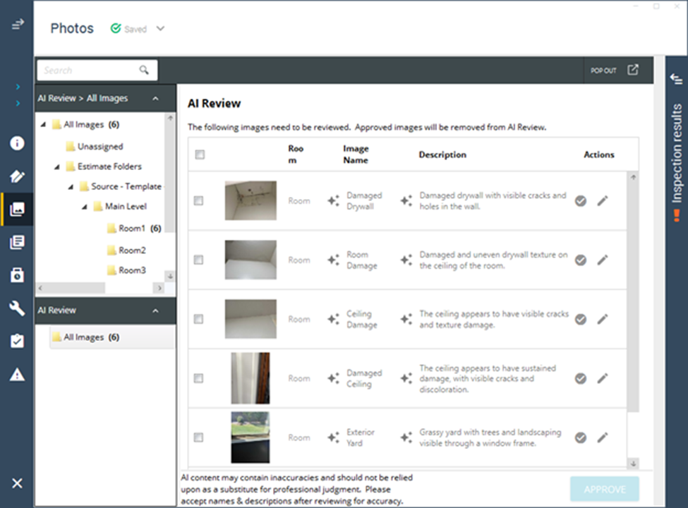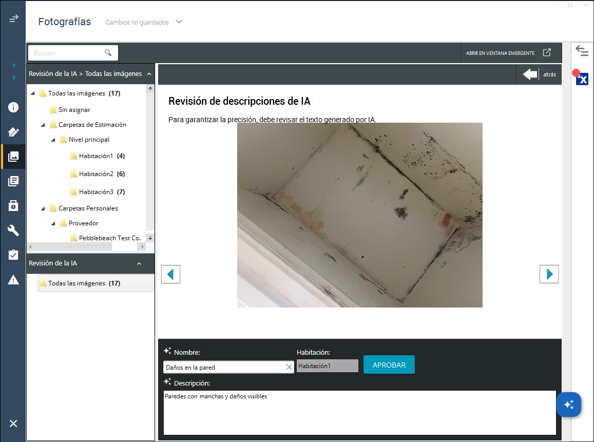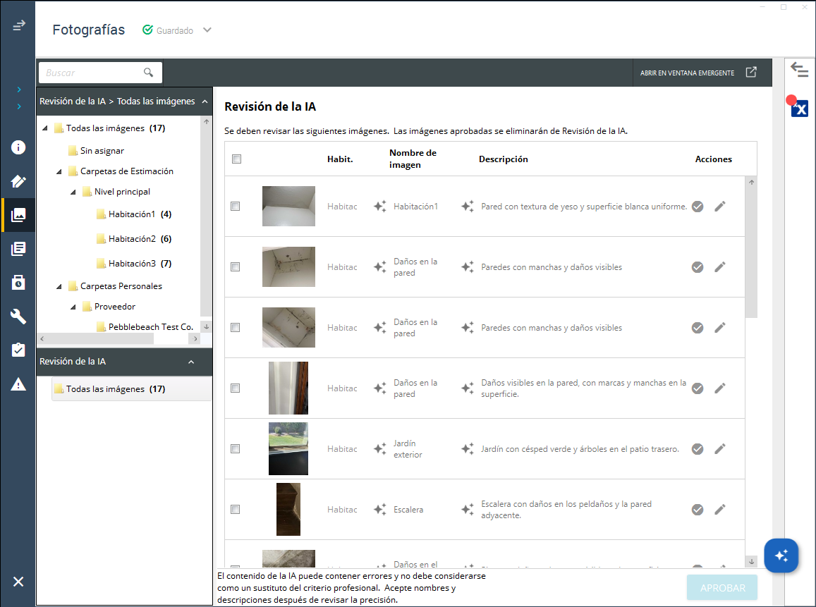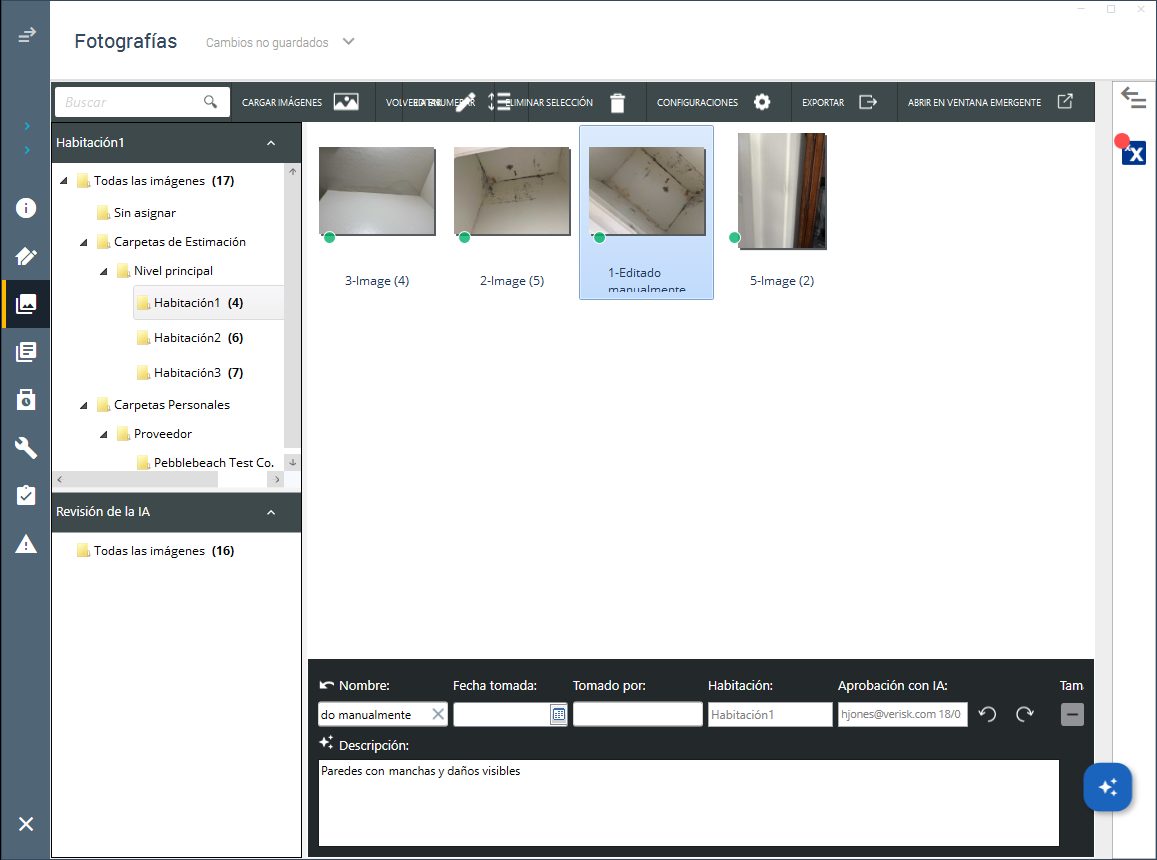 Una vez que agrega fotos a una habitación o carpeta específica, XactAI comienza a revisar las imágenes automáticamente y crea un nombre y una descripción para cada una. Cuando inicia, aparece una sección adicional (llamada Revisión de IA) en el panel de navegación Fotos.