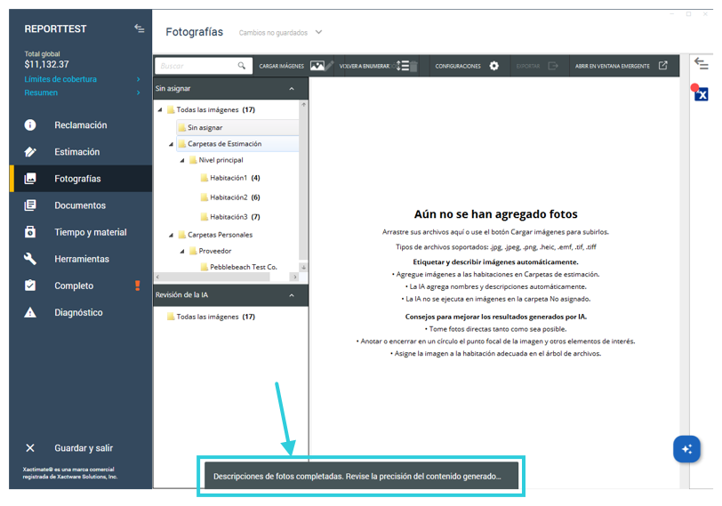 Xactimate ahora incorpora IA para crear descripciones de fotos en sus proyectos. Si desea agregarlo a su cuenta, comuníquese con su gerente de cuenta o con nuestro departamento de ventas (800-424-9228). También puede comprar XactAI en la tienda de Xactware.